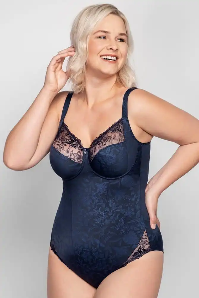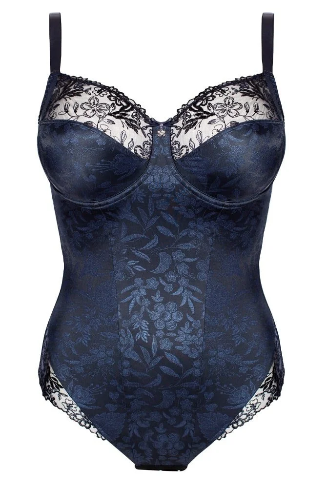 Wir lieben Bodys, Sie auch? Serie Jasmin bietet einen Body mit mittlerer Festigkeit. Das Cup ist wie der Bügel-BH Jasmin gearbeitet und überzeugt durch ein viergeteiltes innenliegendes Cup, mit Verstärkung aus fester Wirkware in der Unterbrust. Das Vorderteil des Bodys ist in der Mitte mit festem elastischem Tüll unterlegt und gibt dadurch entsprechend Halt und Form in der Bauchpartie. Der dekorative Stickerei Einsatz am vorderen Beinabschluss verhindert unangenehmes Einschneiden. Auch hier kommen die hochwertigen Jacquard-Träger entsprechend der jeweiligen Größen zum Einsatz. Die Rückenpartie verläuft oben gerade und wird im Po-Bereich mit einem weichen schmalen Gummiband umschlossen. Die dekorative Schleife mit Blütenanhänger ist auch hier das absolute Glanzstück.